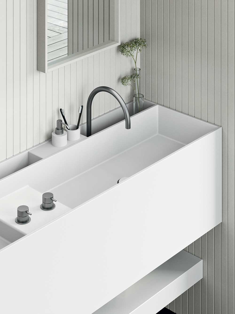 Per completare l’ambiente bagno e la collezione, Unico propone vasche integrate con sistemi benessere, piatti doccia, specchiere, rubinetterie, accessori e complementi, oltre a rivestimenti, tutti realizzati in Corian®, materiale che Rexa è in grado di plasmare, personalizzare e rendere flessibile per adattarsi ad ogni progetto. Questo grazie al legame che l’azienda mantiene da sempre tra l’efficienza tecnologica del suo processo industriale e il tocco dei maestri artigiani che imprime alle sue proposte.