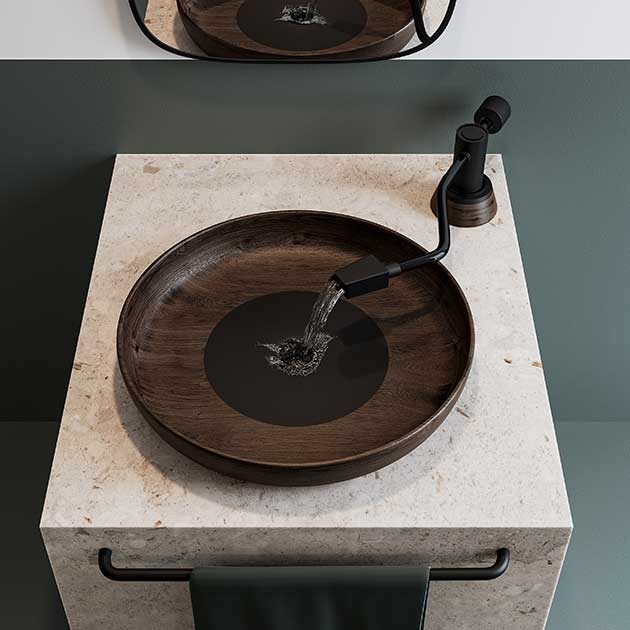 Pasque D. Mawalla, lavabo in legno di teak Santuri. Funziona come un giradischi: spostando a destra il rubinetto il flusso d´acqua si interrompe |