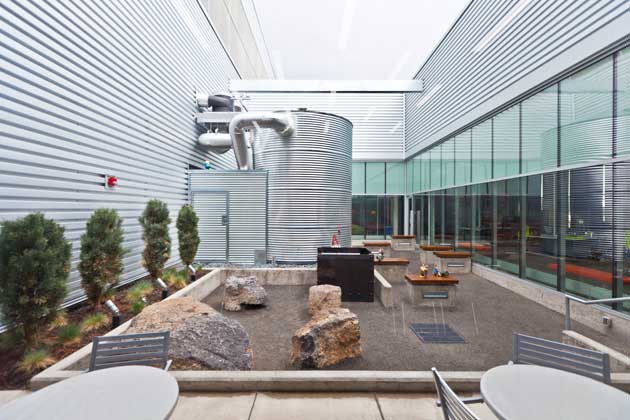 | Una corte interna contribuisce all´illuminazione naturale degli uffici, riduce l´effetto “isola di calore” e offre spazi esterni di relax. Sul fondo il contenitore di acqua piovana usata per i servizi e l´irrigazione. |