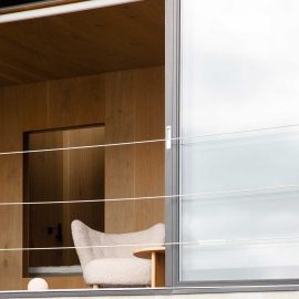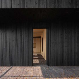L’abitazione, esternamente rivestita in legno nero, comprende due camere da letto, costruite contro la naturale pendenza del terreno per creare uno spazio accogliente e intimo. Entrambe sono definite da un grande lucernario, che permette una trasparenza tra natura e architettura, invitando all’interno la luce naturale e la vegetazione circostante.
