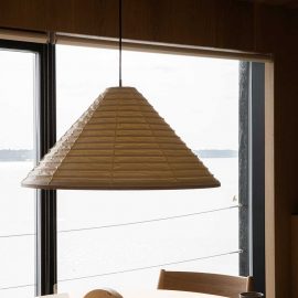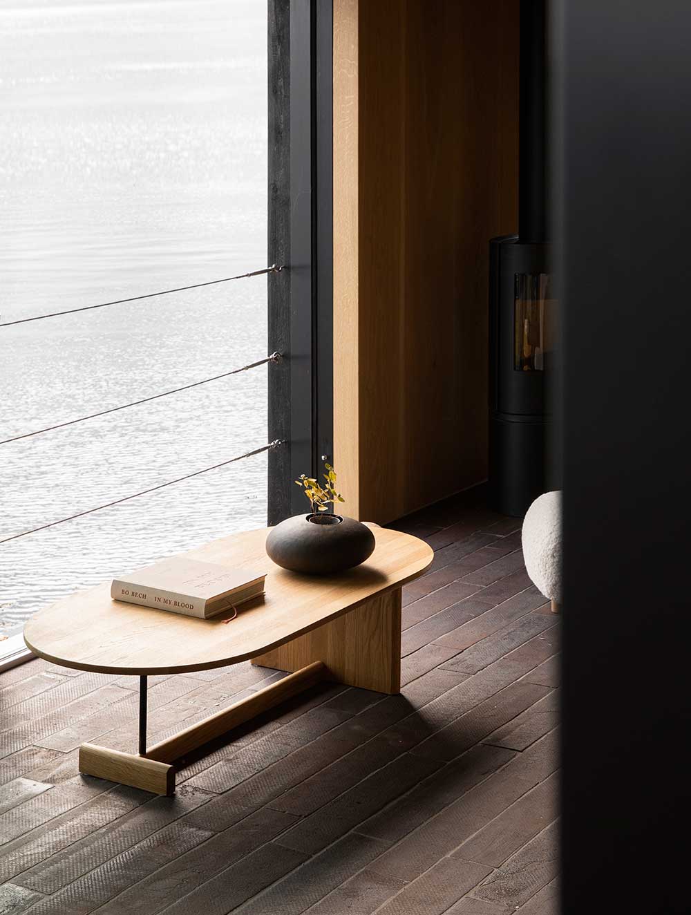 La selezione degli arredi contribuisce a dare vita alla calma atmosfera degli interni. Come la lampada da terra Hashira, progettata da Norm Architects per Menu, ispirata ai produttori giapponesi di carta washi, e le lampade prodotte dall’azienda giapponese Kojima Shouten, piccoli dettagli di design che si ispirano ai porti di pesca giapponesi aggiungendo un’estetica marittima agli interni.