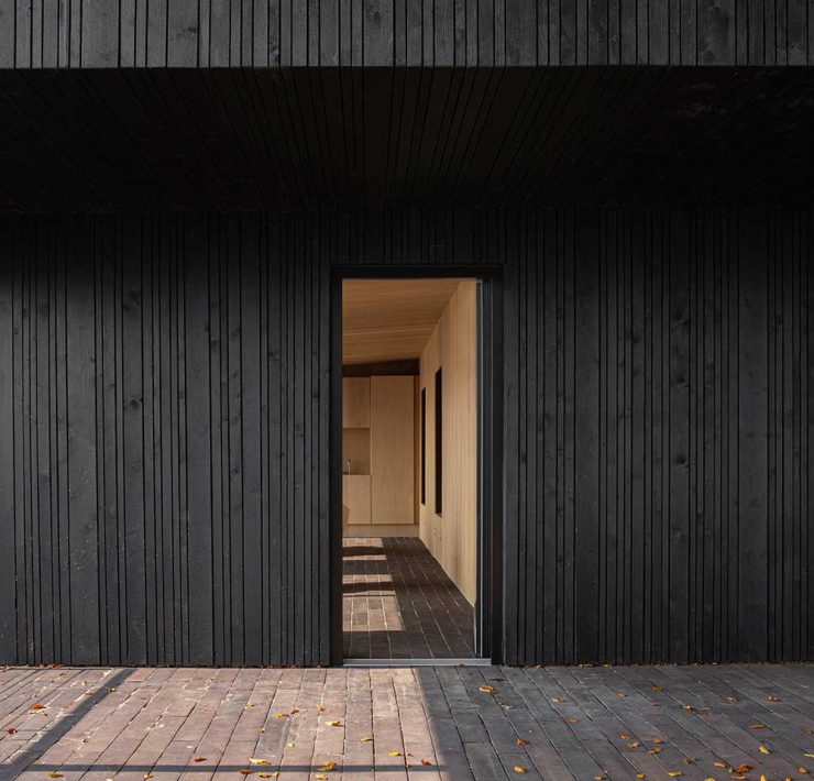 L’abitazione, esternamente rivestita in legno nero, comprende due camere da letto, costruite contro la naturale pendenza del terreno per creare uno spazio accogliente e intimo. Entrambe sono definite da un grande lucernario, che permette una trasparenza tra natura e architettura, invitando all’interno la luce naturale e la vegetazione circostante.