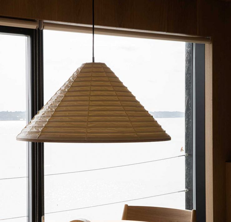 La selezione degli arredi contribuisce a dare vita alla calma atmosfera degli interni. Come la lampada da terra Hashira, progettata da Norm Architects per Menu, ispirata ai produttori giapponesi di carta washi, e le lampade prodotte dall’azienda giapponese Kojima Shouten, piccoli dettagli di design che si ispirano ai porti di pesca giapponesi aggiungendo un’estetica marittima agli interni.