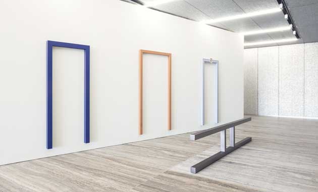 Alla parete, da sinistra: Deep Ultramarine Blue Portal V, 1966/67; Dull Orange Portal I, 1966; Decorated Light Gray Portal with Nickel Crown and Plate, 1967-72; Metalloid Gray-Brown Fence Object, 1967-68 (foto delfino Sisto Legnani, courtesy Fondazione Prada).