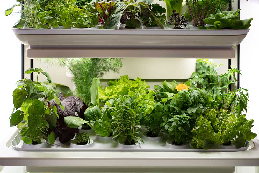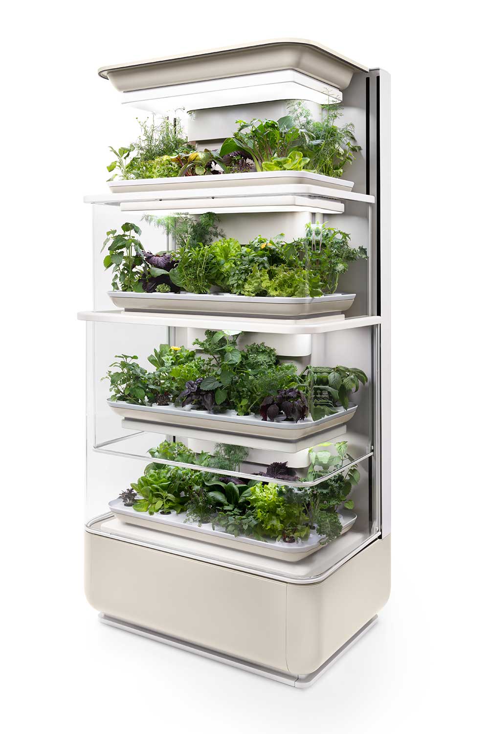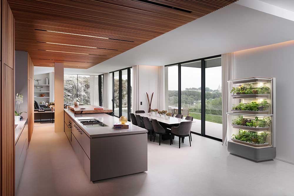Estetica contemporanea, coltura idroponica e intelligenza artificiale per coltivare prodotti freschi direttamente nella propria cucina.