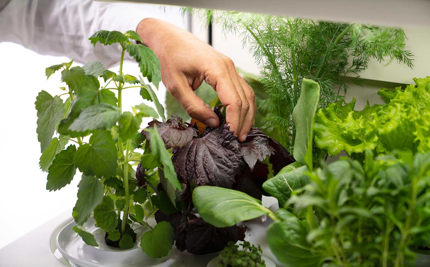 Estetica contemporanea, coltura idroponica e intelligenza artificiale per coltivare prodotti freschi direttamente nella propria cucina.