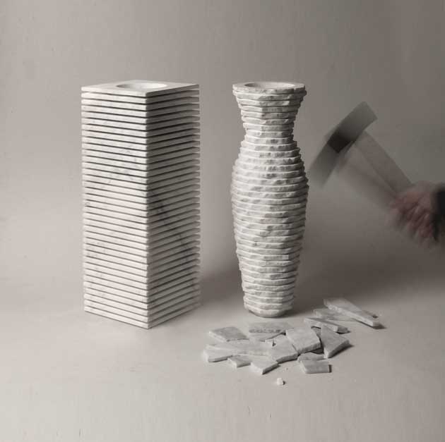 Se si lega tutto questo alla migliore tradizione artigiana del nostro Paese ne risultano creazioni emozionanti e riconoscibili, riconducibili a un vissuto comune ma nel contempo adeguate ad essere collocate sul mercato internazionale, come la parete di pixel, realizzata con tasselli in marmo a base rettangolare grandi quanto un dito su cui Ulian interviene staccandone alcuni così da creare un disegno. Oppure Introverso, come il vaso in marmo bianco di Carrara che cela un altro vaso di forma differente da “liberare” attraverso l’uso di un martello.