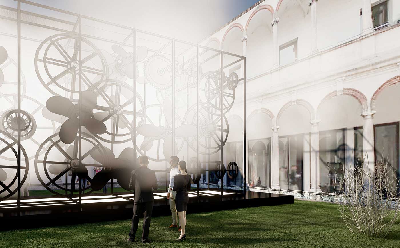 Collocata al centro del Cortile del ‘700, l’intera struttura poggia su una piattaforma retroilluminata che esalta un meccanismo realizzato con eliche e ruote dentate azionate grazie al nuovo sistema a idrogeno che Sanlorenzo sta sviluppando per la propulsione delle proprie imbarcazioni in collaborazione con Siemens Energy, basato sull’impiego di moduli combinati di reformer/fuel cell a metanolo verde.
