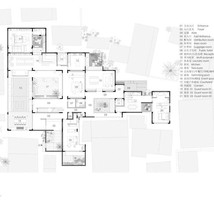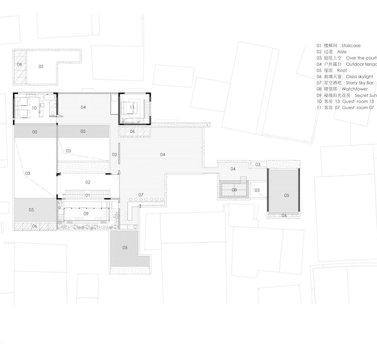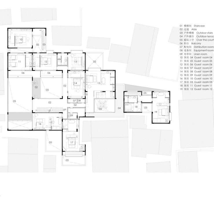 Per raggiungerlo è necessario percorrere le vie strette e tortuose di Bishan. Privo di accesso veicolare, disposto su un terreno irregolare, con spazio limitato e visuali ristrette, il progetto ha trasformato questi vincoli nell’opportunità di creare ambienti appartati e introversi, trasportando all’interno, con corti e patii, il tessuto urbano tradizionale e chiudendo il complesso verso l’esterno per assicurare privacy e tranquillità agli ospiti.