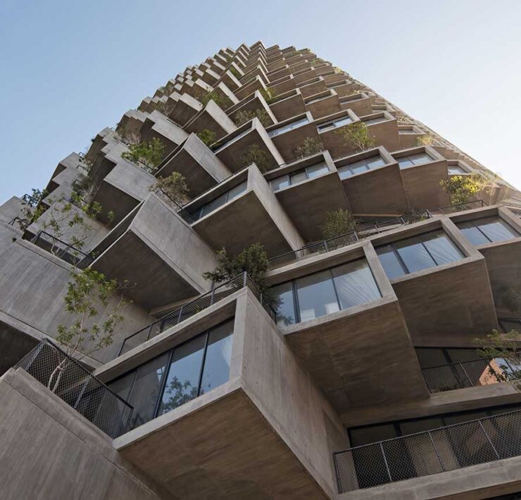 Una scala lunga 140 metri – che funge anche da scala antincendio – si snoda a spirale intorno all’edificio, con terrazze-ballatoio a ogni piano