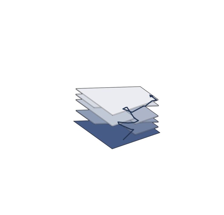 Entrando dall’ingresso principale attraverso una porta vetrata di tre metri di altezza, la vita interna dell’edificio si rivela attraverso viste diagonali fino all’ultimo piano, guidate da una scala centrale a zig-zag in acciaio scuro che collega visivamente e fisicamente i sette livelli.