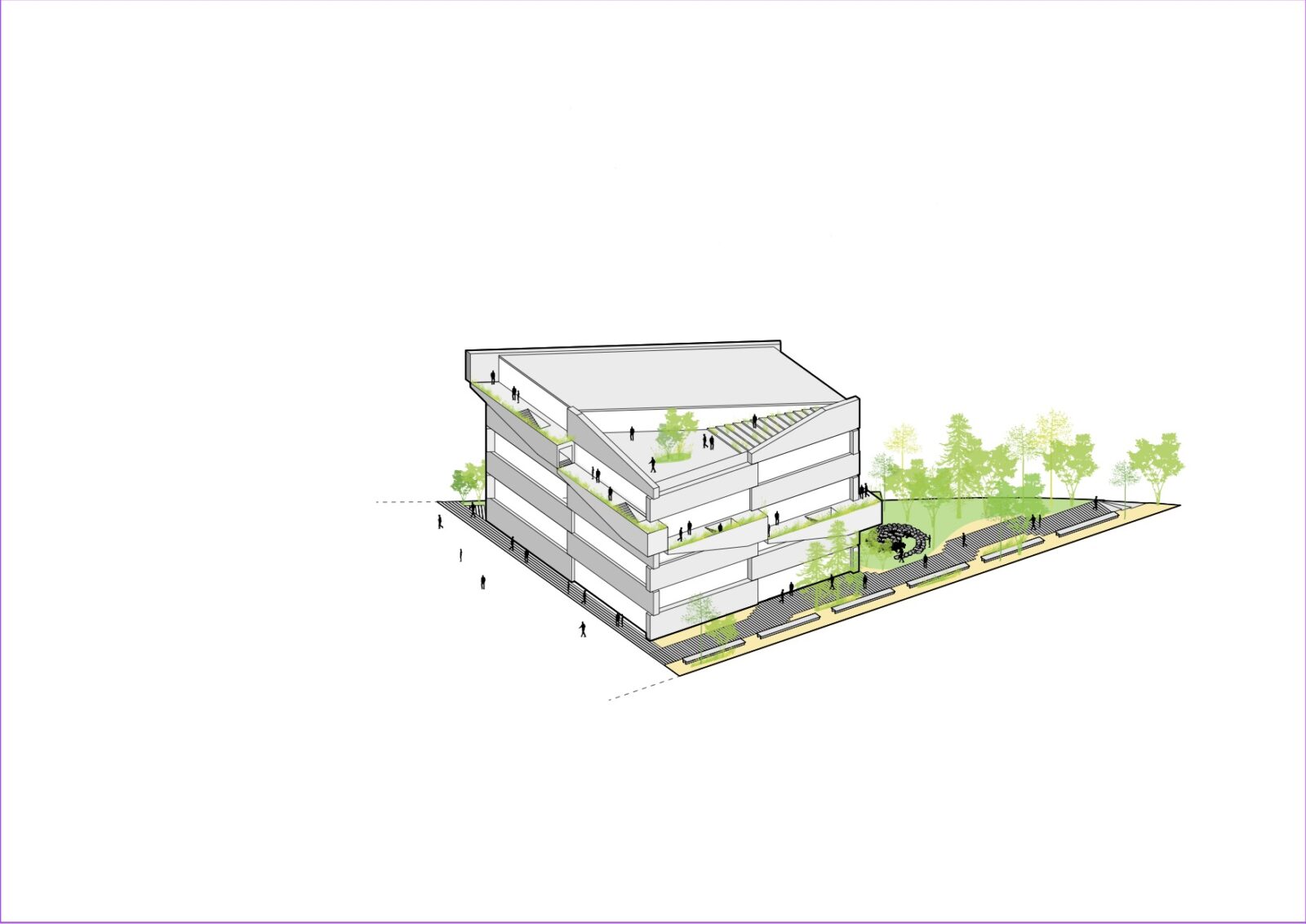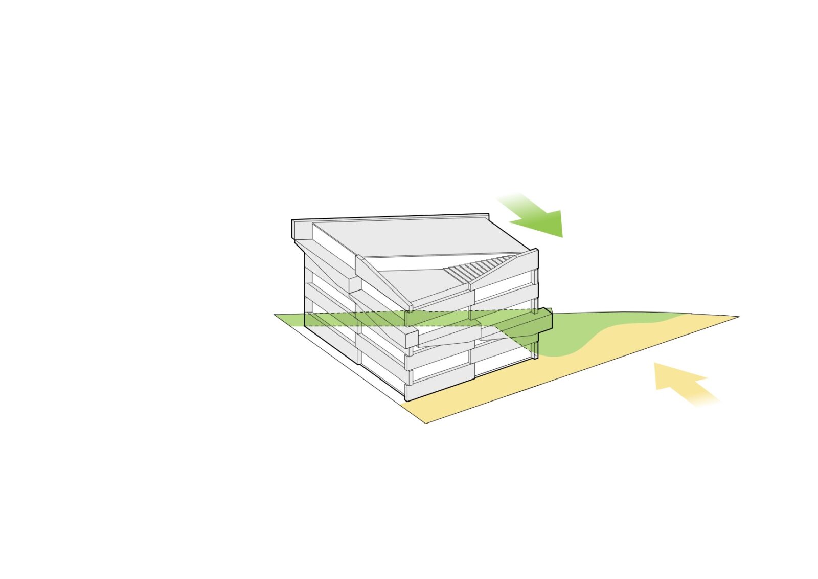 Ai piedi dell’edificio, BIG Landscape ha trasformato un ex parcheggio in un parco pubblico di 1.500 mq, ispirato alle spiagge e alle foreste costiere del paesaggio danese. Verso nord, pini e querce proteggono dai rigidi venti che spirano dal mare. Verso sud sono state create aree con piante, rocce e boschi per favorire la creazione di habitat per la biodiversità e una superficie morbida per il gioco e il relax.