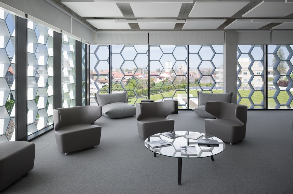 Uno degli elementi più riconoscibili è la torre cubica rivestita da pannelli esagonali in alluminio bianco che richiamano l’immaginario calcistico – la trama del pallone, la rete di una porta di calcio – e al tempo stesso dialogano con la luce naturale, generando un disegno dinamico di ombre e riflessi.