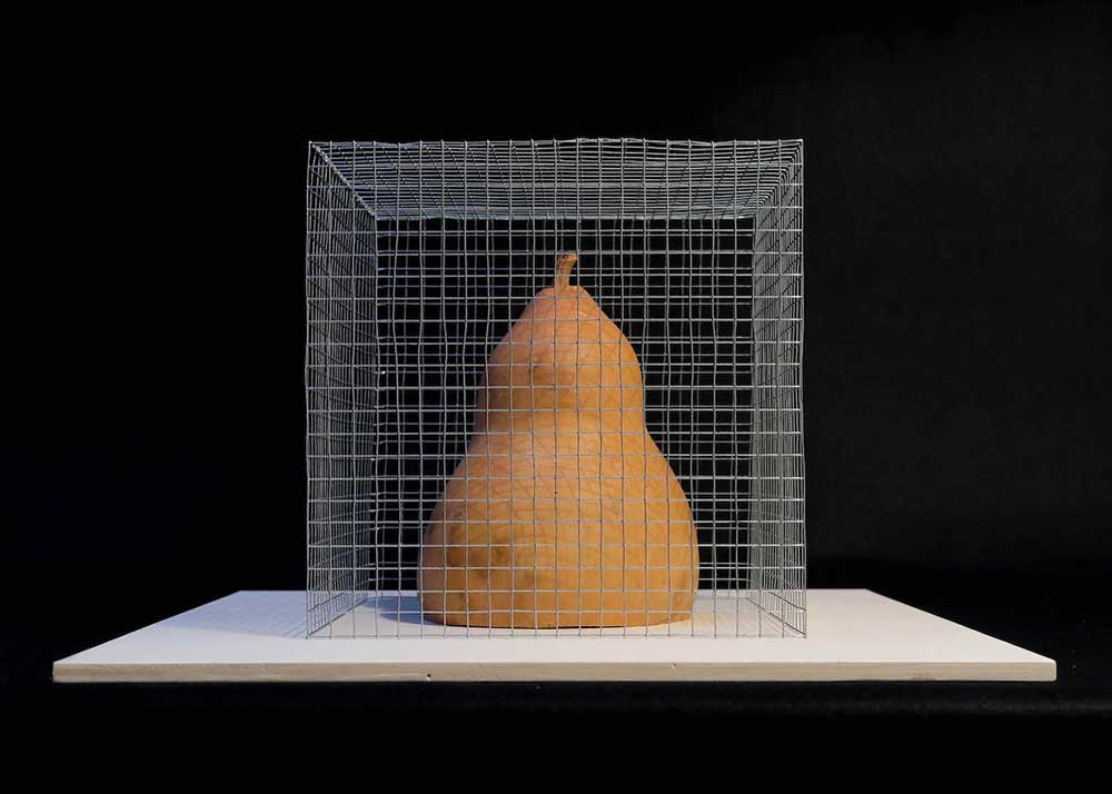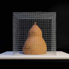 Andrea Branzi, Archetipi 7, 2019, zucca, legno e rete metallica, 50 x 50 h 40 cm. "Gli archetipi sono quei modelli teorici, mentali, che anticipano tutte le nostre attività creative; si tratta di un patrimonio antropologico non evidente, che giace nel profondo del nostro istinto, quando diamo forma e sostanza a nuove forme espressive. In architettura significa fare riferimento a strutture primarie come le capanne, i recinti, le strutture agricole, la cui funzione non è definita in rapporto all’abitare ma al costruire, intesa come attività primaria prima che funzionale. Oggi l’architettura civile vive una crisi di credibilità, nel senso che il suo rapporto con la società si è progressivamente logorato; a sua volta la società vive una profonda crisi e non è più in grado di fornire quadri di valori al progetto. In questo contesto la riflessione sugli archetipi primari diventa importante perché essi non sono una eredità del passato, ma piuttosto un repertorio da inventare; non sono cioè un repertorio certo ma piuttosto un materiale da indagare dentro la profondità della nostra mente". Andrea Branzi