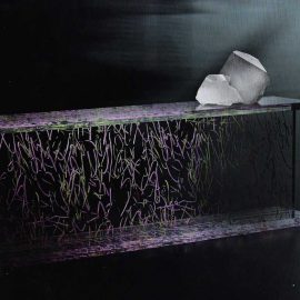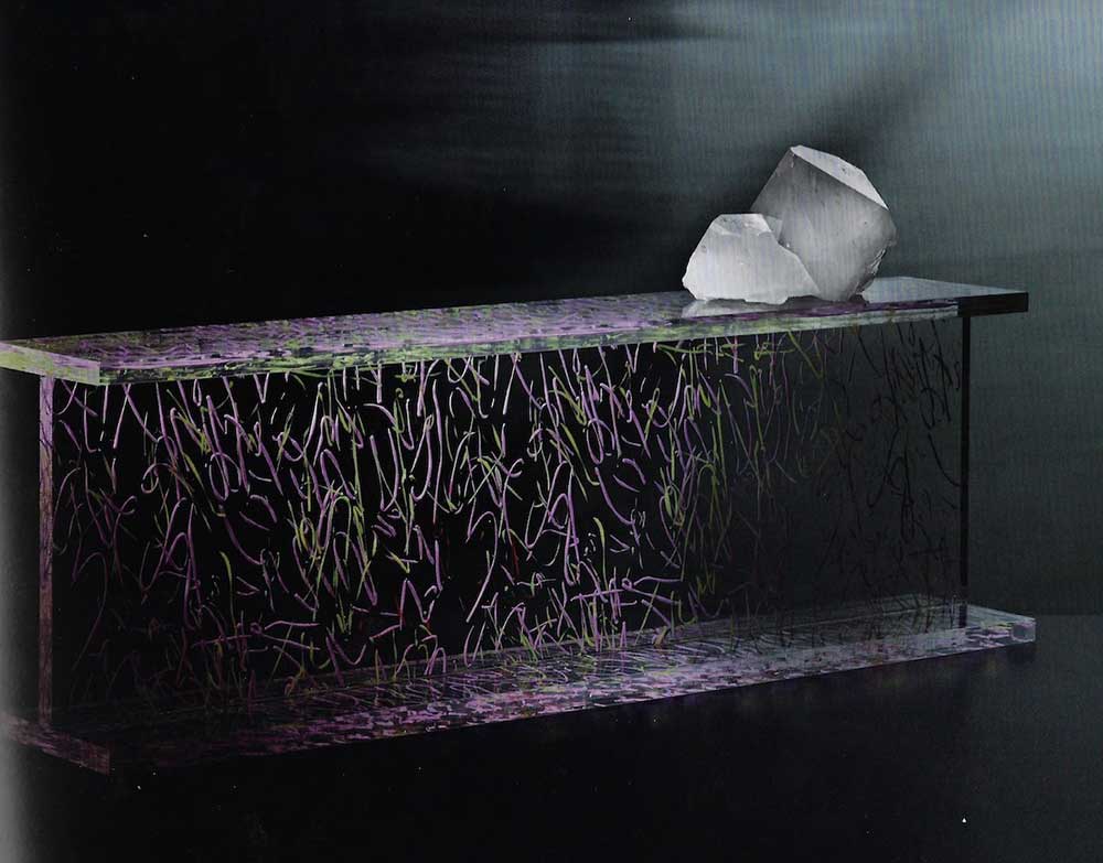 Andrea Branzi, Transparencies: Erbe 4. Mensola in plexiglas trasparente incolore con disegni interni colore verde, viola, bianco, nero e rosso. Edizione numerata 16 Nilufar. prod. Metea, 2011, 56 x 10 x 18 cm. "Forme limpide e luminose che non hanno ombra e fanno vedere il mondo opaco che le circonda, e come lenti di ingrandimento lo dilatano. Sono come meduse, intermedie tra l’acqua e un organismo vivente. Questi vasi contengono al loro interno spazi dove galleggiano genomi, erbe o polvere d’oro. Ho sempre pensato che i vasi non sono soltanto vasi. Essi non sono nati per contenere qualcosa, ma per rappresentare con la loro forma concava i cicli generatori dell’universo, i buchi neri del cosmo. Il lento movimento circolare del tornio, su cui nascono, riproduce l’energia ciclica delle costellazioni, un movimento generatore che dal fango fa nascere tutte le forme e la vita. Il fuoco che tutto consuma, consolida la loro terra rendendola eterna. I vasi sono presenti in tutte le civiltà, in tutti i paesi, in tutti i deserti; i piccoli frammenti dispersi di antichissime brocche sono la testimonianza certa dell’esistenza su quel terreno di villaggi scomparsi o dell’accampamento di nomadi in marcia. All’interno di un vaso si conserva dunque un frammento della storia dell’uomo e del suo rapporto con l’universo; una penombra sacra. Transparency guarda dentro a questa penombra, a questo interno sempre nascosto, per svelarne la segreta bellezza". Andrea Branzi, 2017
