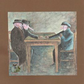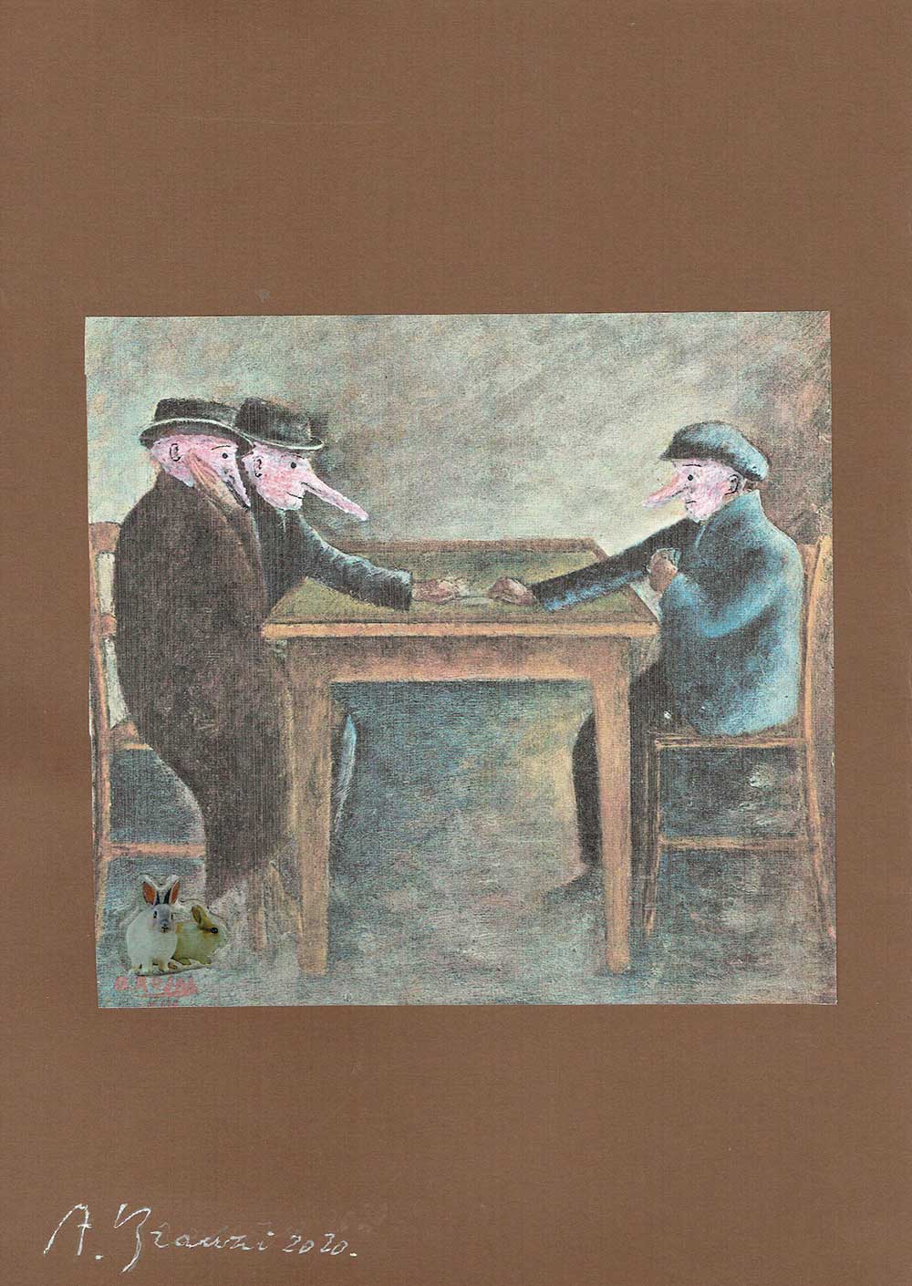 Andrea Branzi, Pinocchio 3. Tecnica mista su carta. 2020. cm 29,7 x 21. "Come in una poesia di Giorgio Caproni, l’immagine di Pinocchio attraversa Genova, serena e luminosa come una filastrocca; da Bacon, a Rosai, fino Masaccio e la Cina; senza imparare niente, senza ridere e senza piangere, ma ascoltando il vento di Tramontana… Pinocchio spaventa i bambini, con il suo racconto terrificante, fatto di buio, di freddo, di fame e di ladri, dove il Re non esiste, i vecchi si picchiano, il grillo è ucciso a martellate, l’asinello è affogato e il burattino impiccato... L’Appennino di Pinocchio è quello delle stragi di Marzabotto, di Sant’Anna di Stazzema, del Mostro di Firenze, di Via Rasella, delle Fosse Ardeatine. Lucignolo è un fascista… Cosa speravano di ottenere i bambini nel Paese dei Balocchi? Una Città Ideale, il socialismo, la fine del lavoro, una Utopia, una merenda con il burro spalmato davanti e di dietro, una pera sbucciata, un cane da guardie e le Faine ladre? La Fata Turchina è morta?... Alla fine il burattino diventerà un bambino qualsiasi; ma con l’industrializzazione saranno proprio i bambini che diventeranno marionette, omologate, servili, integrate… Questo girotondo intorno a Pinocchio ci sorprende sempre perché è un mistero amaro, come piace ai poeti e agli artisti; un girotondo infinito che attraversa il mondo, senza incontrare consolazioni ma soltanto spaventosa novella della nonna… Un nastro infinito di burattini, che sorridono danzando intorno al fuoco spento del cammino…". Andrea Branzi