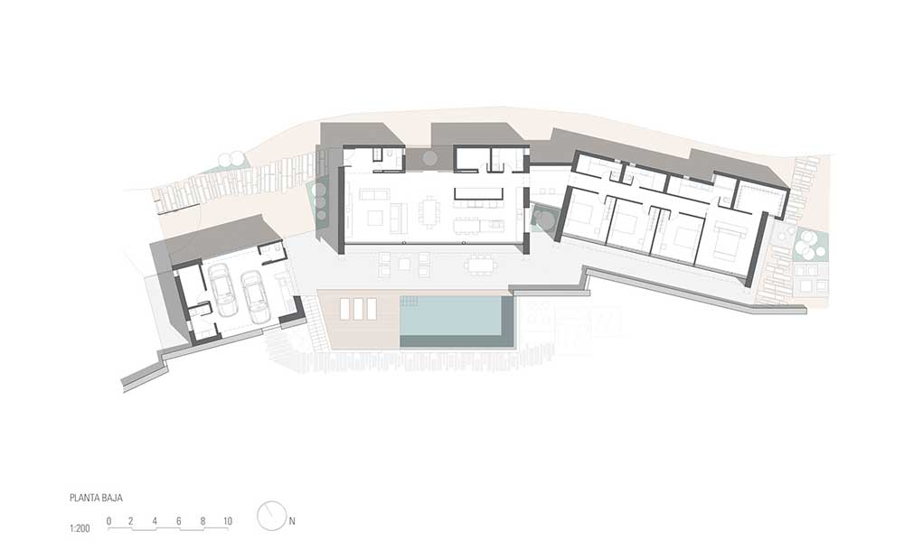 La Palometa è composta da tre moduli sviluppati su un unico piano, due per abitazione e l’altro per il garage-barbecue: un modulo è dedicato alla zona giorno, con soggiorno-pranzo e cucina, con servizi e stireria, nell’altro si si trovano tre stanze con due bagni e una suite completa di bagno.