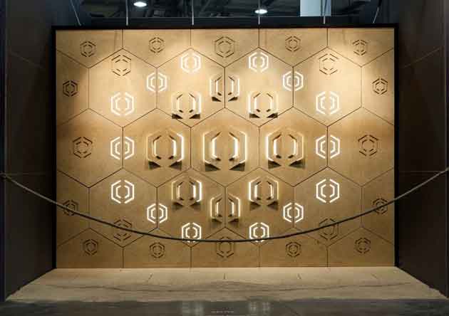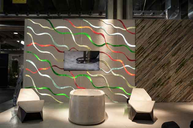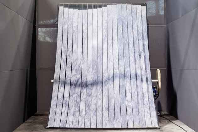 La meccanica incontra la pietra in questa parete di sottili fogli lapidei percorsi da un moto che ne evidenzia la flessibilità. Meccanismo in collaborazione con RECIPIENT CC, granito e marmo forniti da Fabio Molteni.