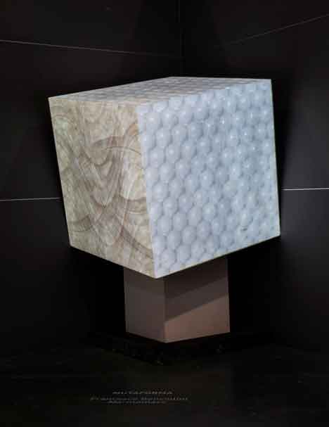 Un cubo di marmo che sfida la pesantezza rivelando facce dai pattern sempre diversi – gentilmente concessi da Raffaello Galliotto e Lithos Desing – che affiorano l’uno sull´altro.