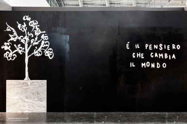 Associando natura e cultura, la grande parete di marmo nero da cui prende vita un albero rivela la fluidità contenuta nella pietra liberata dal pensiero nel suo divenire.