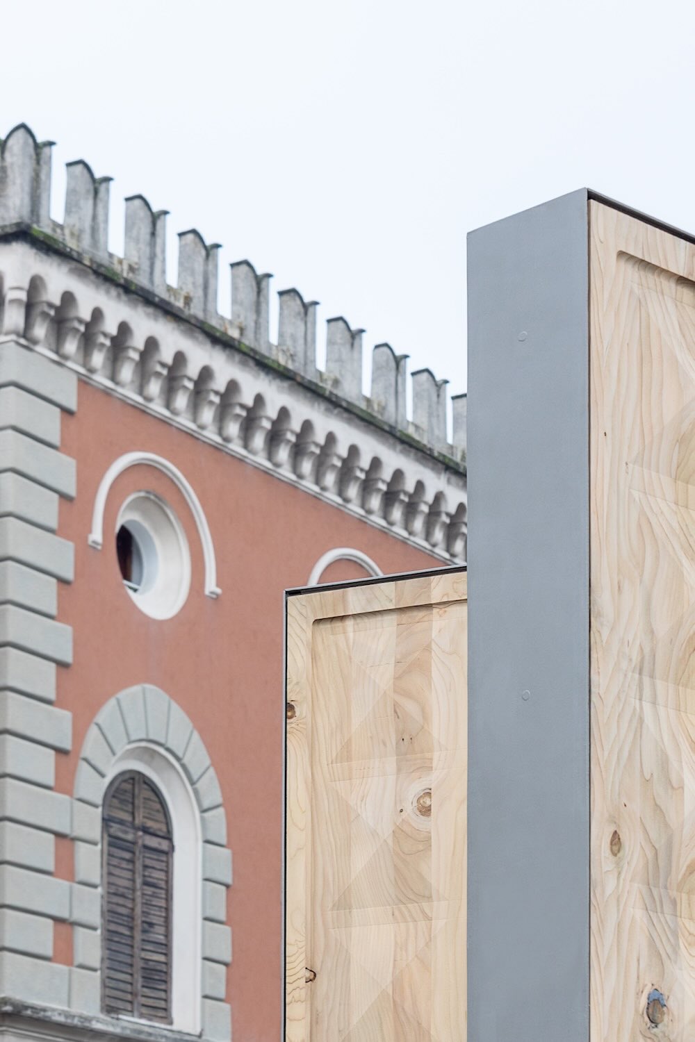 La porta ideata da De Lucchi è composta da due alti battenti semichiusi, privi di telaio e di muro. La superficie è trattata con un bugnato sfaccettato che richiama il Palazzo dei Diamanti di Ferrara, ph. ©Federico Montanari.