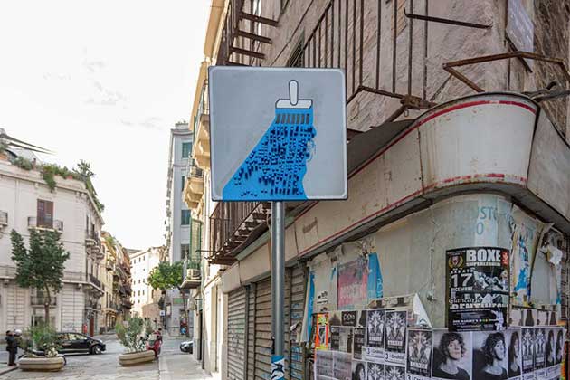Cartello temporaneo di rifacimento della segnaletica orizzontale: utilizzando inserti plastici l´artista catanese Luca Prete ha ridisegnato lo skyline di Palermo completamente ricoperto da una grande pennellata di blu. Il segnale si trova in Piazza Sant´Anna, incrocio via Lattarini. |