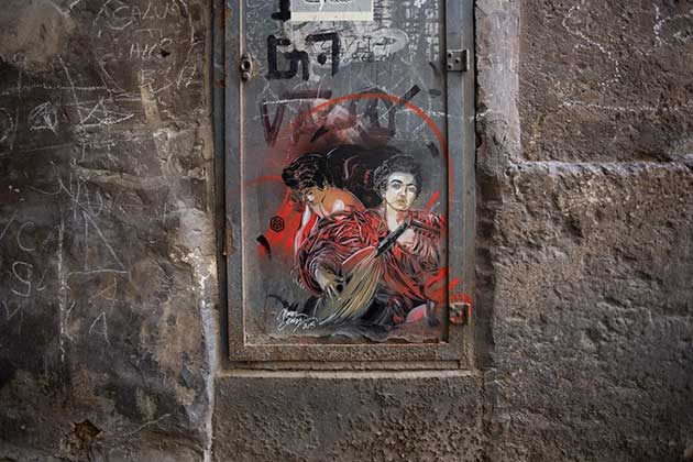 Concerto o “I Musici”: una delle poche reinterpretazioni stencil del noto artista francese C215 resistita al furto seriale delle opere componenti la sua serie “Sur les trances de Caravaggio”, realizzata nel 2015 sui muri di Palermo. L´opera si trova in Via Biscottari, nei pressi di Palazzo Sclafani (ph. Mauro Filippi). |