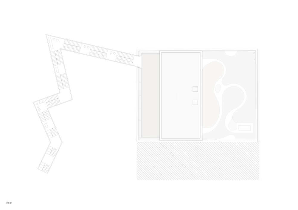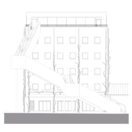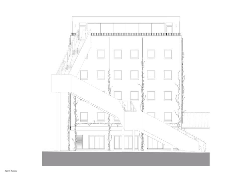 Di un brillante colore giallo, la struttura è completata da un padiglione e una terrazza sul tetto, in moduli di legno prefabbricati, accessibili tramite una grande scalinata esterna.