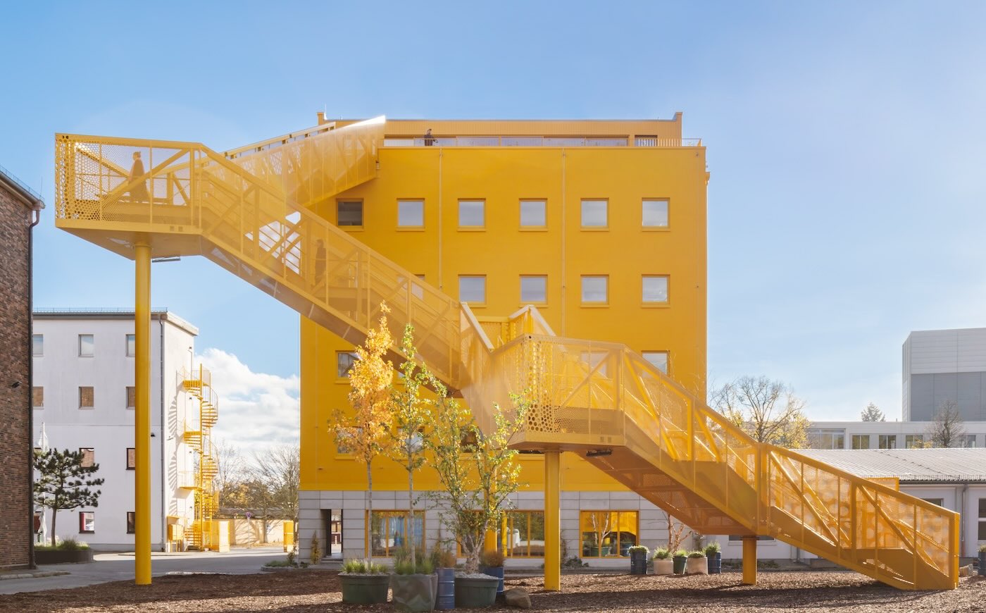 Una volta entrati nel campus, i visitatori incontrano immediatamente un altro segno chiaro: dalla piazza centrale dell’Atelier Gardens, la scalinata gialla a zig-zag, punteggiata da posti a sedere e piattaforme panoramiche, conduce al tetto, con viste sullo skyline di Berlino.