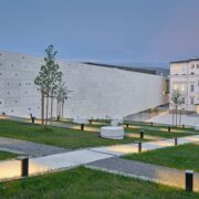 Con balaustre in metallo, marmo di Vicenza e marmorino, uniti da cornici metalliche, l’artista tedesco ha sviluppato una scala a spirale che collega il primo e il secondo piano del palazzo del XVIII secolo.