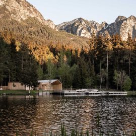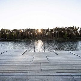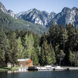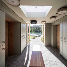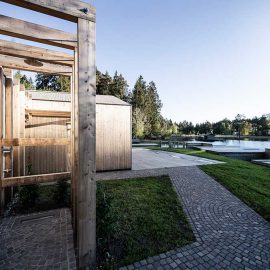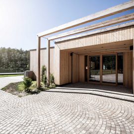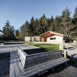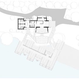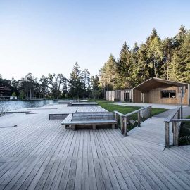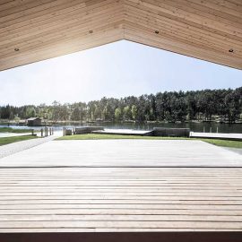 L’architettura sobria dà ancora più spazio alla vegetazione, integrandosi delicatamente con essa. I pontili quasi ramificati e di nuova costruzione che sfociano nel lago sono stati ricavati dal legname dei boschi circostanti.