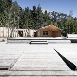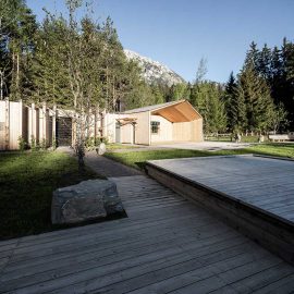 L’insieme è profondamente connesso al paesaggio naturale unico che lo ospita, con scorci sul lago, sul bosco e sulle montagne e prospettive avvolgenti. In quest’ottica si inserisce la facciata in legno di larice, volutamente priva di trattamenti e lasciata al suo destino naturale, che la vedrà cambiare lentamente con il tempo e con le condizioni atmosferiche.