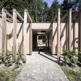 La seconda struttura – un cubo separato, seppur non indipendente, collegato alla zona ristoro in continuità architettonica e funzionale – è ad uso pubblico. Qui si trovano servizi igienici liberamente accessibili e privi di barriere architettoniche, e spogliatoi per bagnanti e pattinatori. Lungo l’asse centrale, dove si sviluppa anche un piccolo atrio con armadietti e spogliatoi, il cubo rimane aperto, offrendo uno scorcio continuo sulla natura e una cornice particolarmente accogliente per bagnanti ed escursionisti.