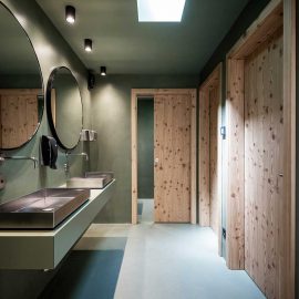 Per la pavimentazione dei locali a libera fruizione si è optato per una robusta tecnica a resina spatolata, in grado di resistere alle sollecitazioni, ad esempio dei pattini, e di garantire al tempo stesso la massima sicurezza sul bagnato. Il design degli interni parla la stessa lingua della natura circostante – una proposta degli architetti per creare un chiaro leitmotiv visivo tra esterno e interno. Come colore di base è stato scelto il verde, che si ritrova su pavimenti, pareti e soffitti. Pavimenti e pareti caratterizzati anche, in maniera leggera e irregolare, dal motivo del tipico merletto altoatesino: un effetto ottenuto imprimendo per breve tempo una matrice sulla resina ne sullo stucco.