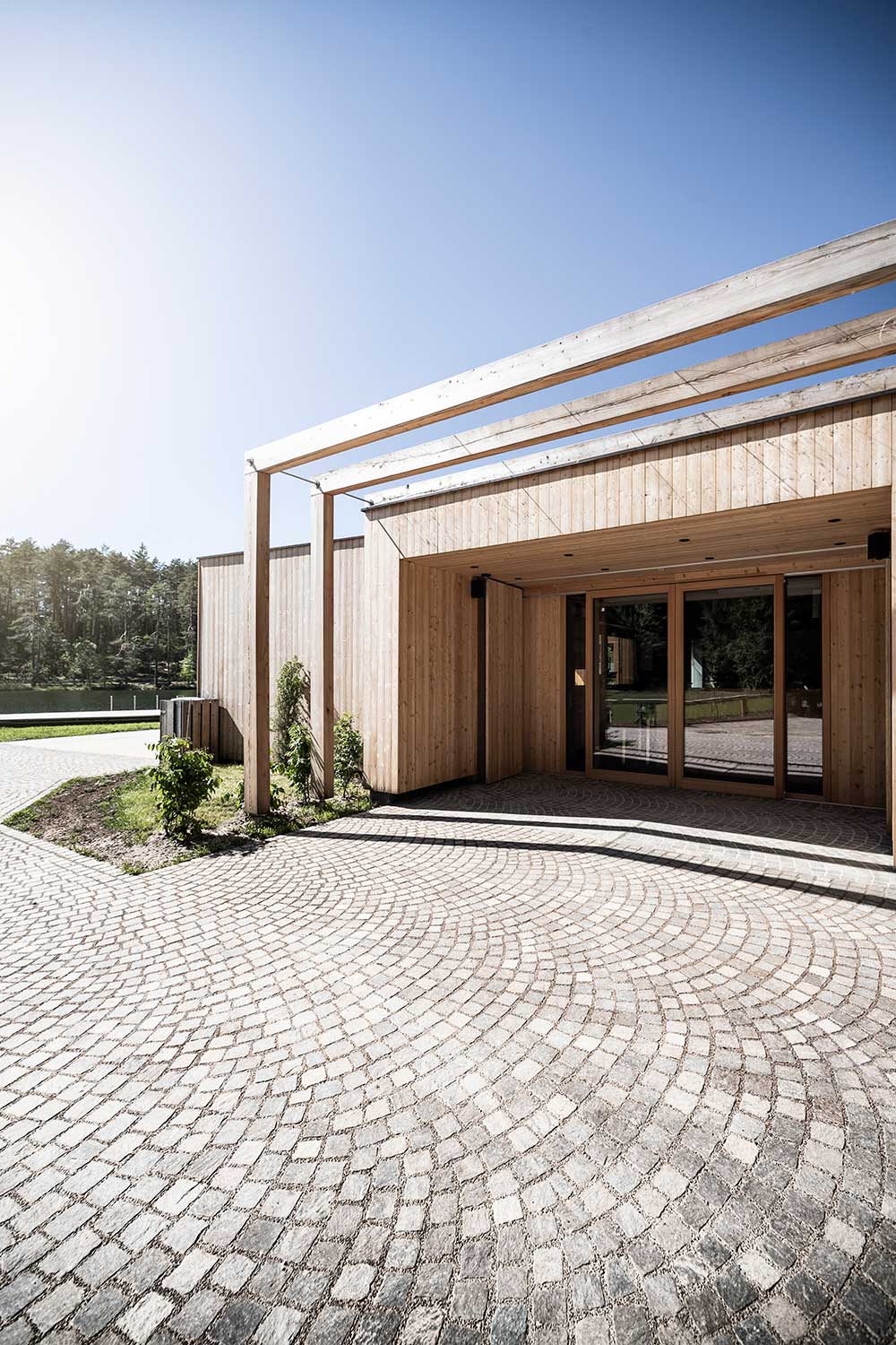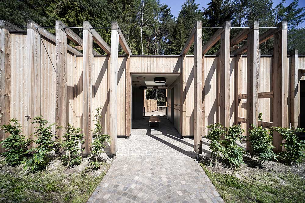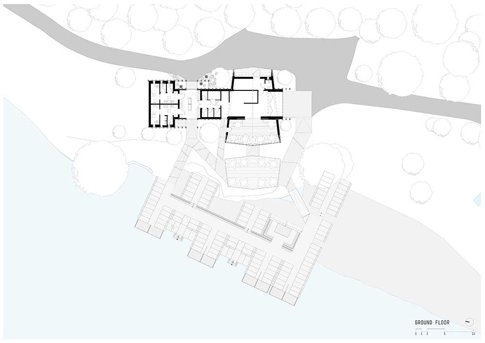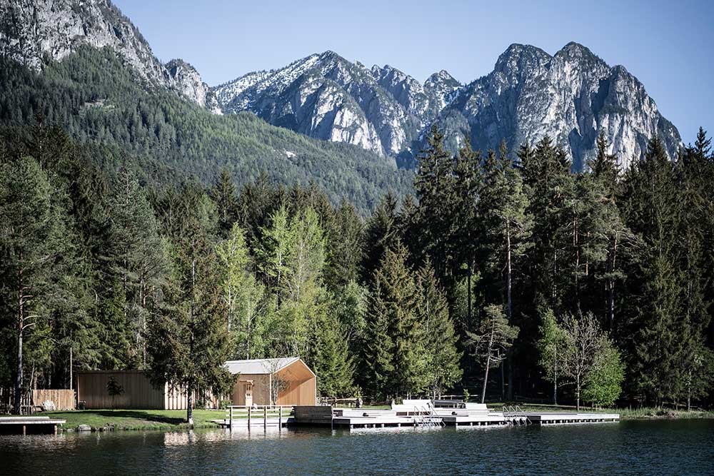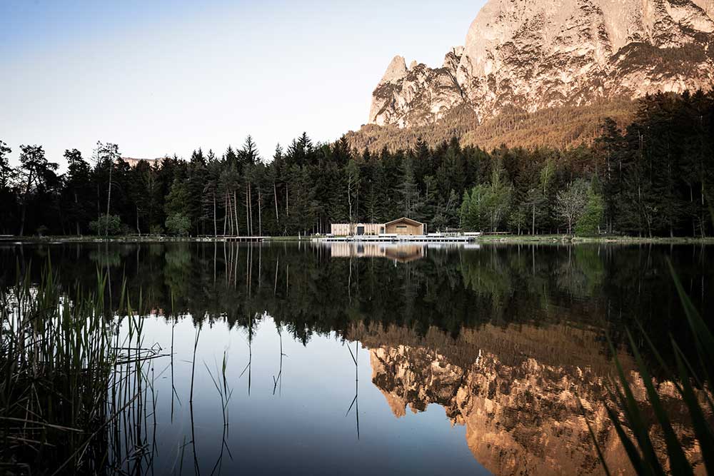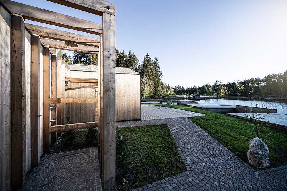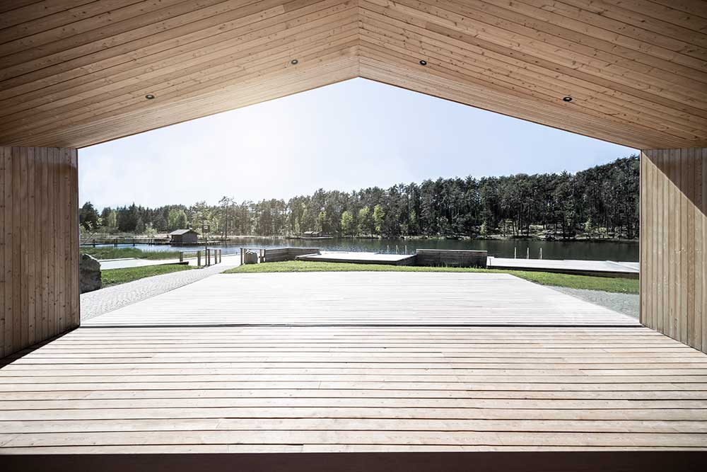 L’architettura sobria dà ancora più spazio alla vegetazione, integrandosi delicatamente con essa. I pontili quasi ramificati e di nuova costruzione che sfociano nel lago sono stati ricavati dal legname dei boschi circostanti.