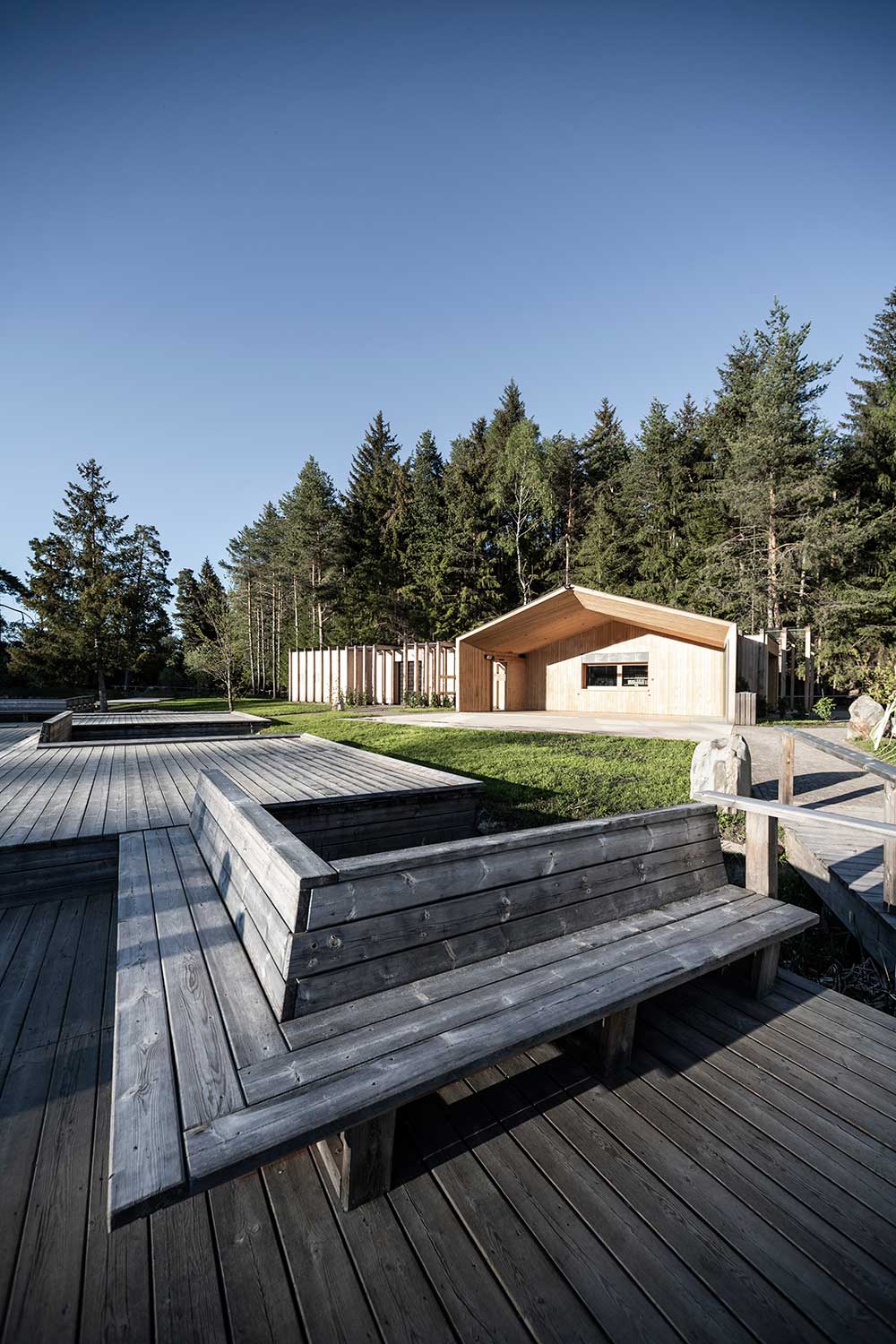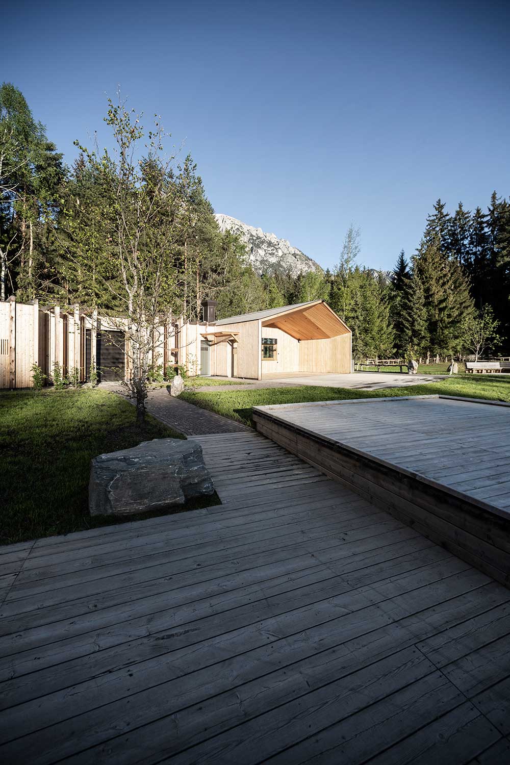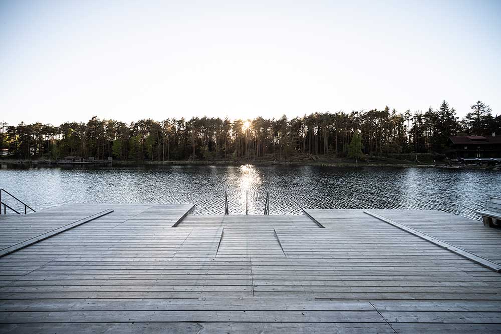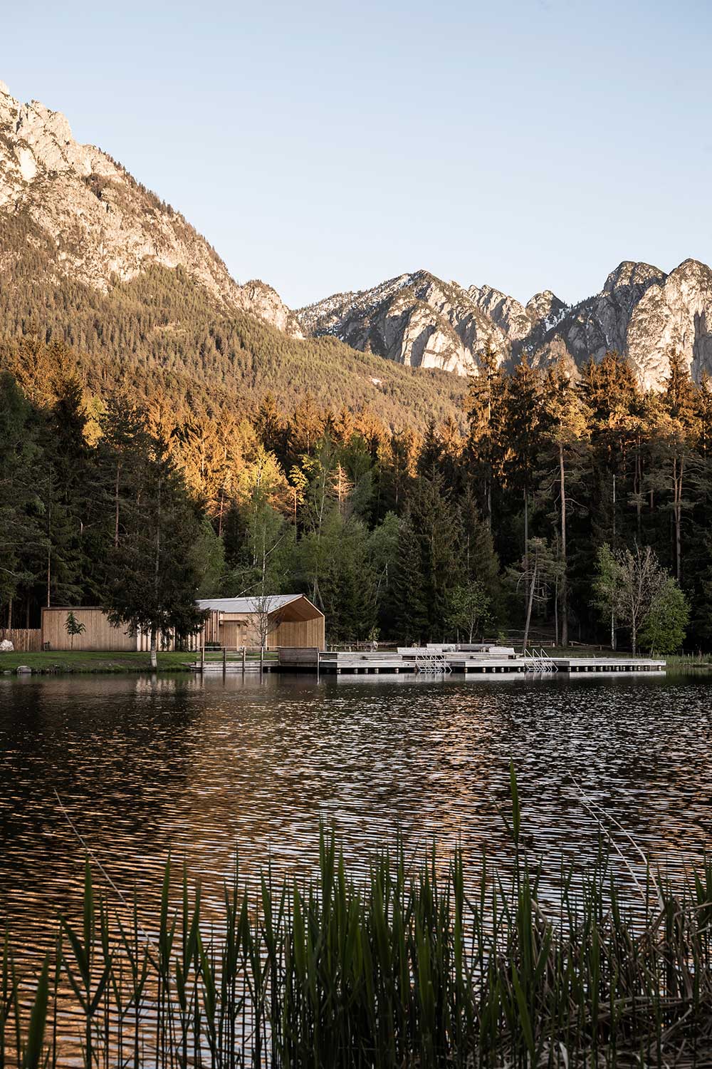 L’architettura sobria dà ancora più spazio alla vegetazione, integrandosi delicatamente con essa. I pontili quasi ramificati e di nuova costruzione che sfociano nel lago sono stati ricavati dal legname dei boschi circostanti.