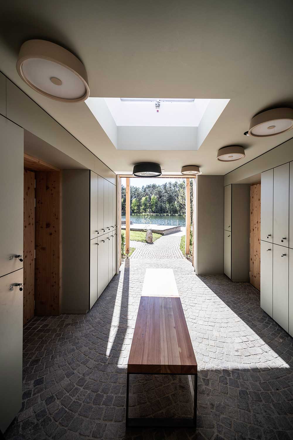 La seconda struttura – un cubo separato, seppur non indipendente, collegato alla zona ristoro in continuità architettonica e funzionale – è ad uso pubblico. Qui si trovano servizi igienici liberamente accessibili e privi di barriere architettoniche, e spogliatoi per bagnanti e pattinatori. Lungo l’asse centrale, dove si sviluppa anche un piccolo atrio con armadietti e spogliatoi, il cubo rimane aperto, offrendo uno scorcio continuo sulla natura e una cornice particolarmente accogliente per bagnanti ed escursionisti.