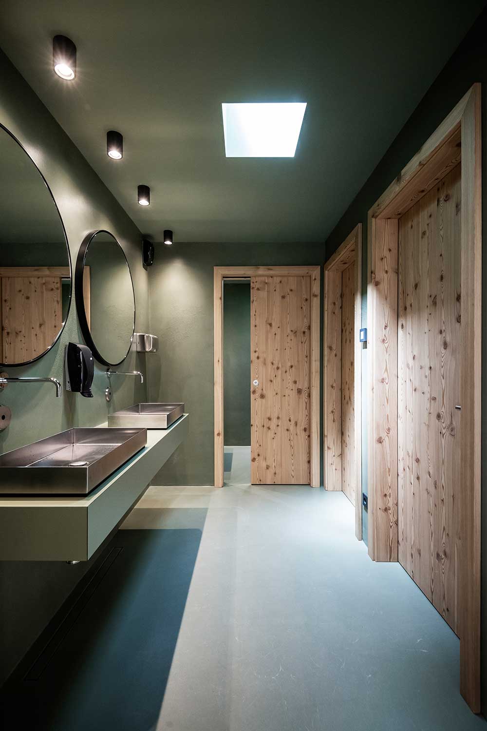 Per la pavimentazione dei locali a libera fruizione si è optato per una robusta tecnica a resina spatolata, in grado di resistere alle sollecitazioni, ad esempio dei pattini, e di garantire al tempo stesso la massima sicurezza sul bagnato. Il design degli interni parla la stessa lingua della natura circostante – una proposta degli architetti per creare un chiaro leitmotiv visivo tra esterno e interno. Come colore di base è stato scelto il verde, che si ritrova su pavimenti, pareti e soffitti. Pavimenti e pareti caratterizzati anche, in maniera leggera e irregolare, dal motivo del tipico merletto altoatesino: un effetto ottenuto imprimendo per breve tempo una matrice sulla resina ne sullo stucco.