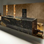 Avignon propone un concetto di scomposizione dello spazio e di sistemi aggregativi che guardano oltre la razionalità industriale. Il progetto è realizzato in legno di eucalipto frisé utilizzato per tutte le ante e i frontali dei cassetti e in marmo Calacatta Copper per i piani, gli schienali, il fronte dell’isola e per la vasca preassemblata.