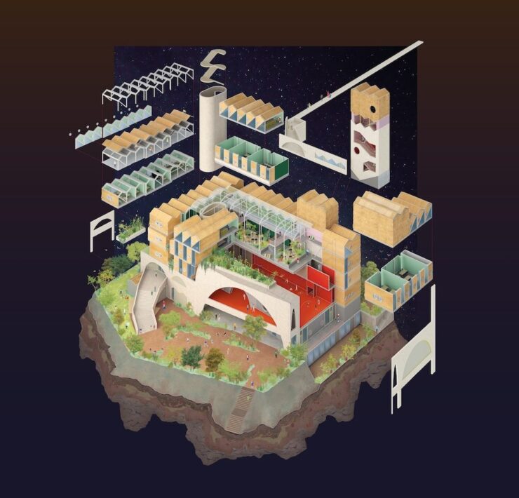 L’architettura è stata sviluppata attraverso una strategia a basso budget per ridurre la propria impronta ambientale basata sui alcuni principi di progettazione come la verticalità per ridurre l’occupazione del suolo.