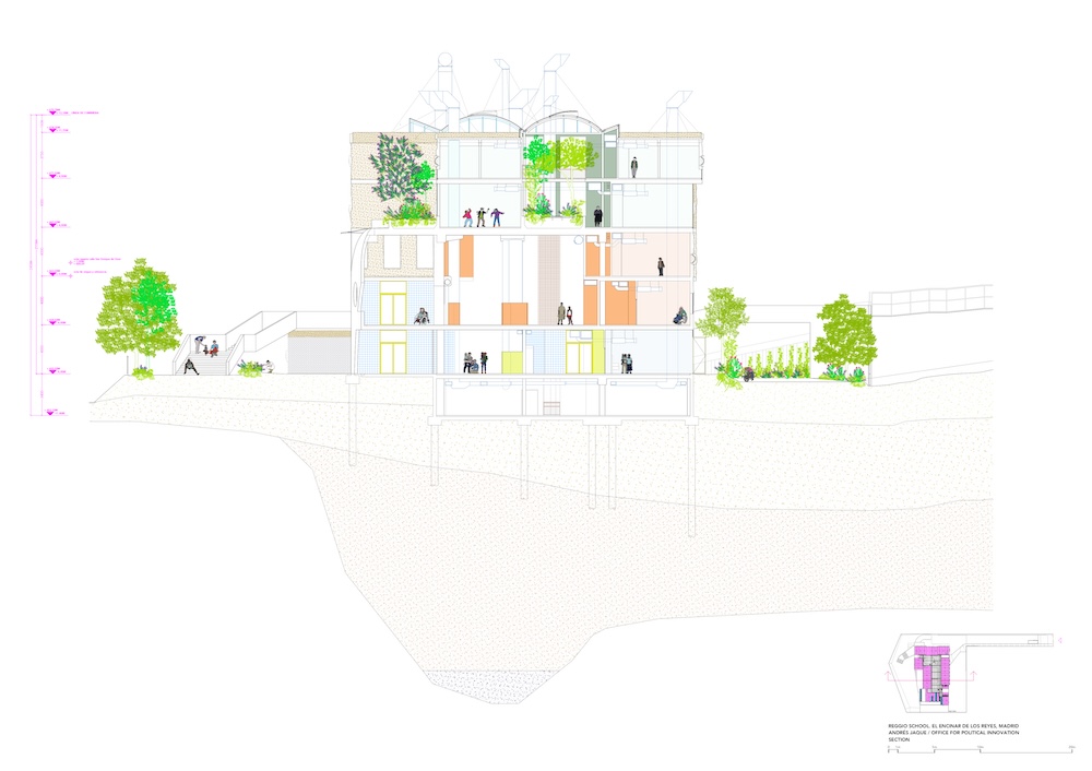 A El Encinar de los Reyes, a nord di Madrid, lo studio di Andrés Jaque / Office for Political Innovation (Offpolinn) ha progettato un edificio scolastico seguendo il Reggio Emilia Approach, filosofia educativa fondata sull’immagine di un bambino con forti potenzialità di sviluppo e soggetto di diritti, che cresce nella relazione con gli altri.