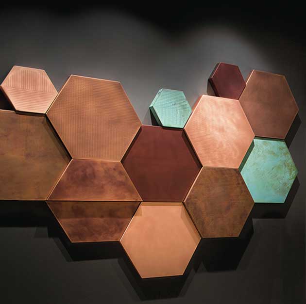 Nella sezione Materiali, DecoDe – Decorative Ecologic Device di De Castelli, design Pino Scaglione: una collezione di moduli esagonali fonoassorbenti a parete realizzati in metallo resi preziosi per la speciale gamma di finiture, texture e cromatismi. Partendo dalle proprietà acustiche dei metalli, De Castelli ha collaborato con il designer Pino Scaglione studiando appositamente per questo progetto un innovativo processo di foratura e taglio laser. |