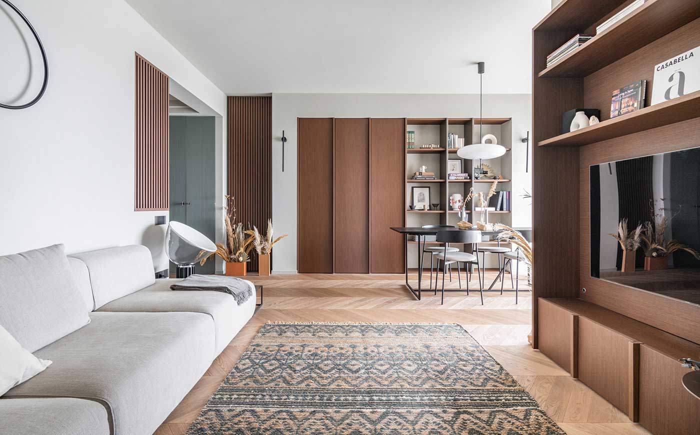 Nell’appartamento, di circa 90 metri quadrati, gli arredi sono incorporati nell’architettura e separano spazi e funzioni in maniera consapevole. La progettazione in pianta è stata guidata dal pavimento in legno, una pregiata spina ungherese della collezione Dream di Woodco.
