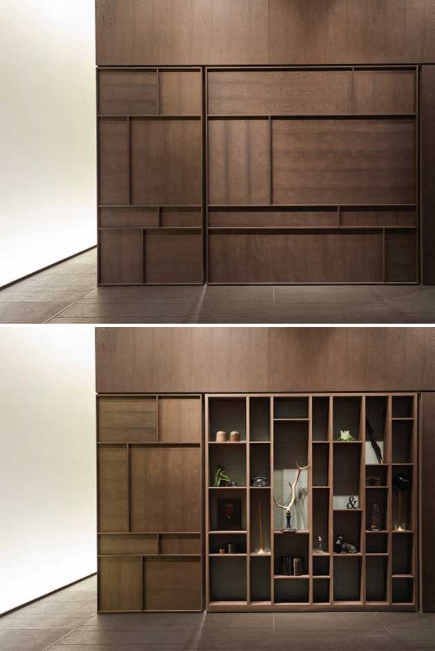 Lybre, disegnata da Piero Lissoni per Lualdi, ci ricorda Il Nome della Rosa: quella che appare come una parete si attiva automaticamente e diventa accesso per ambienti segreti, per poi richiudersi e trasformarsi ancora in una libreria, modificando completamente l´aspetto dell´ambiente in cui ci troviamo.