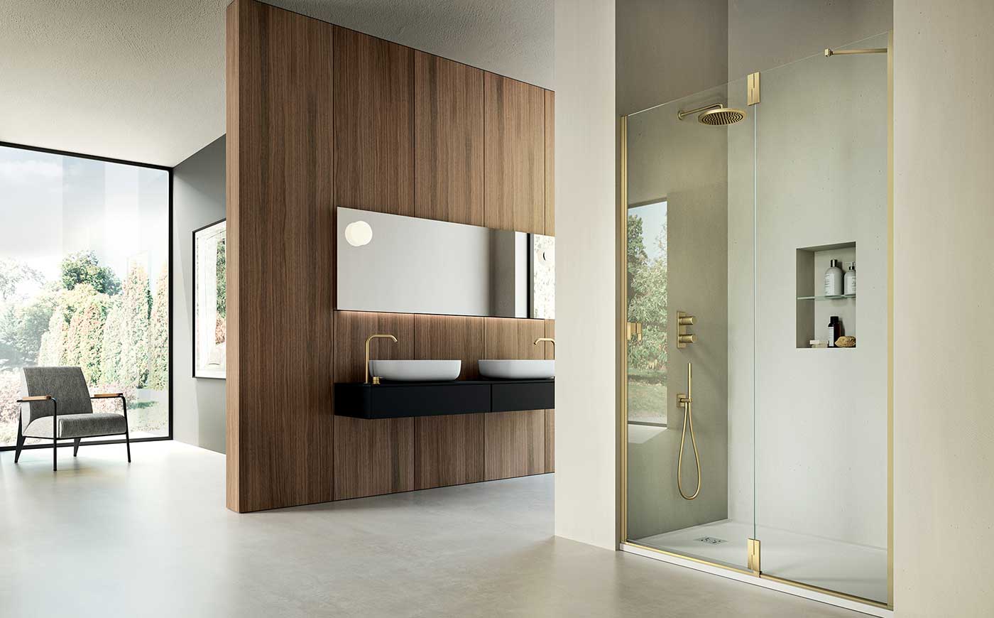 In esposizione presso H2Otto, showroom e spazio di consulenza dedicato alla progettazione del benessere, la nuova cabina doccia di Vismaravetro ad anta battente incernierata si caratterizza per il telaio e le cerniere in oro satinato.