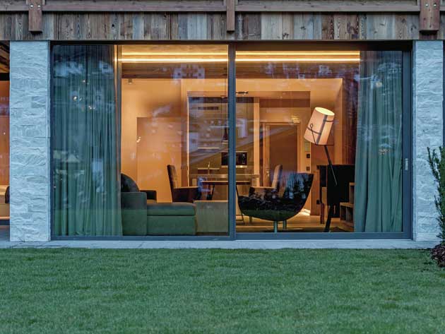 | Le ampie vetrate dello chalet ottenute grazie all´impiego di serramenti in alluminio prodotti da Finstral |