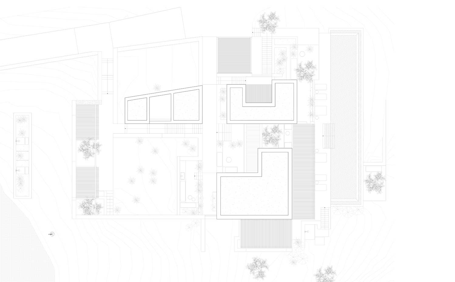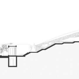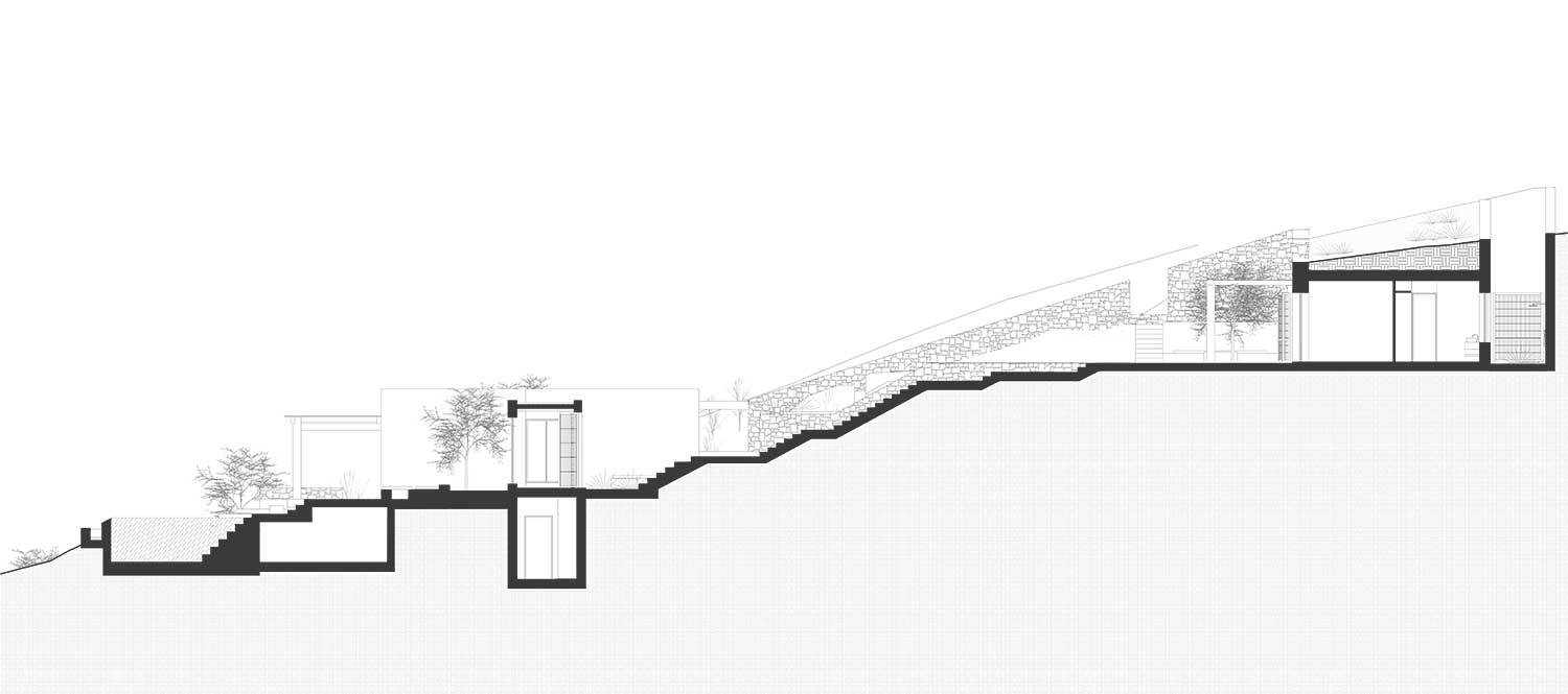 Visto dal mare, l’insieme di volumi bassi, patii e percorsi adagiati sulla pendenza del sito appare quasi come uno dei piccoli villaggi delle Cicladi ma in realtà questa villa dalle generose dimensioni – 500 metri quadrati – è la residenza estiva di una famiglia di quattro persone e dei loro ospiti.