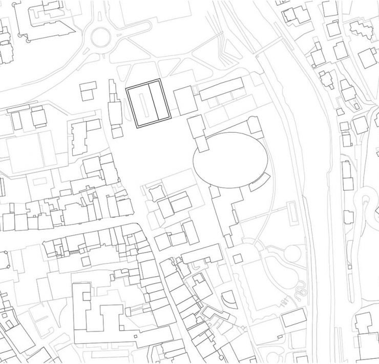 L’intervento infatti, che mira a integrarsi nel tessuto urbano, si caratterizza per una volumetria compatta e riconoscibile, all’interno della quale viene scavato un vuoto urbano racchiuso da un recinto.
