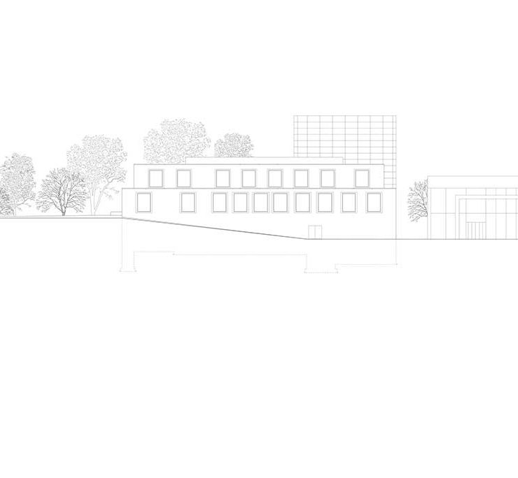 Il recinto, che insieme al volume della Scuola cinge il grande spazio collettivo della corte situata a est, si configura come un volume di due piani all’interno del quale sono collocati gli elementi di distribuzione verticale e alcuni servizi alla città. In questo modo viene garantita continuità visiva tra la piazza e il futuro parco Priel, mentre la profondità di campo verso le montagne a nord e a sud dell’area non viene mai interrotta.