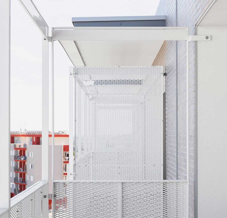 Seguendo l’orientamento solare, i balconi sporgono su Viale Giulini per trarre massimo beneficio dalla luce naturale, e scavati nel volume negli altri prospetti per limitare il fenomeno dell’irraggiamento. Protetti in alto dalla pioggia e lateralmente da schermature in lamiera perforata per aumentare il livello di privacy, ospitano ai lati le infrastrutture tecnologiche e gli stenditoi. La loro conformazione permette la massima personalizzazione interna, senza mai alterare l’estetica generale delle facciate.